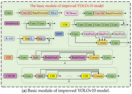 The YOLOv10 model is more lightweight, accurate, and faster than the previous YOLO series models, utilizing the Mosaic method [25] to perform a splicing operation on the input image. It also incorporates an adaptive scaling method to increase the background complexity of the image, which helps to prevent overfitting when training. From YOLOv5, the YOLO series has enhanced backbone network feature extraction capabilities by using a C2f module. This modification is inspired by CSPNet [26] to reduce the computational consumption to enhance the operation speed. A major highlight of the YOLOv10 model is its elimination of Non-Maximum Suppression (NMS) during training. Traditional YOLO models utilize NMS to filter overlapping predictions, which can increase inference latency. In contrast, YOLOv10 removes the necessity for NMS by integrating a dual allocation strategy, resulting in a better performance.