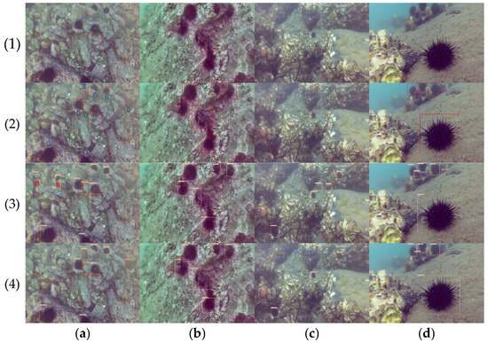 A comparison of the actual detection results on the EUBID dataset is shown in Figure 10, where (1) represents the input image, (2) represents the real labeled data, (3) represents the original YOLOv10 model detection result, and (4) represents the improved YOLOv10 model detection result. From Figure 10(a2), it is evident that targets 1 and 7 share similar colors with the background, which complicates detection. The unoptimized YOLOv10 model failed to detect these two targets; however, the optimized YOLOv10 model successfully identifies targets 1 and 7. This improvement indicates that the optimized model possesses a superior ability to differentiate target objects from the background environment compared to the original model. From Figure 10(a4), it is obvious that the optimized YOLOv10 model did not exhibit any missed or false detections, proving the effectiveness of the model optimization methods. Additionally, from Figure 10(a3), the original YOLOv10 model incorrectly identifies targets 1 and 2. This indicates that the original model failed to extract sufficient key features, leading to the misidentification of black blocks and stones with contour edges as sea urchins. In contrast, the optimized model successfully avoided this issue. More comparison images are also shown in Figure 10.