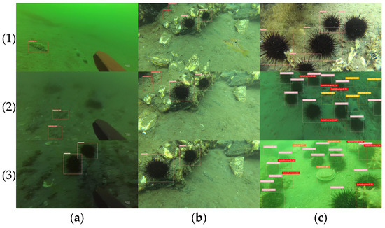 In order to further evaluate the detection performance of the improved model in underwater environments, this study conducted tests using data collected under various underwater conditions. The results are presented in Figure 12, where (a) represents the lighting, (b) represents the depth, and (c) represents the turbidity. From the experimental results under various underwater conditions presented in Figure 12, it is evident that the improved model discussed in this paper demonstrates excellent detection performance. It can accurately identify target organisms across different lighting, depth, and turbidity conditions. Additionally, as shown in column (c), the model also performs well in detecting dense targets.