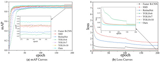 The mAP curves and loss curves of different target detection models during training are shown in Figure 13.