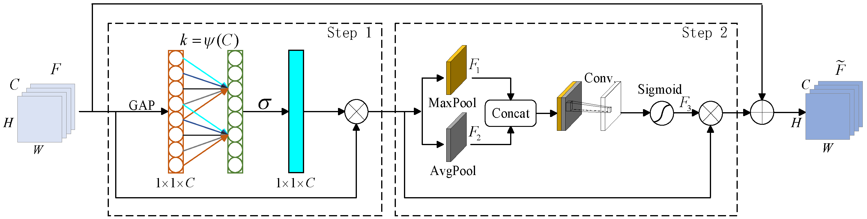 From the figure, Step 1 use global average pooling to generate channel attention weights through fully connected layers, which are used to enable weighted combinations of different channels in the feature map, which avoids reducing dimensionality, while extracting dependency relationships between channels.