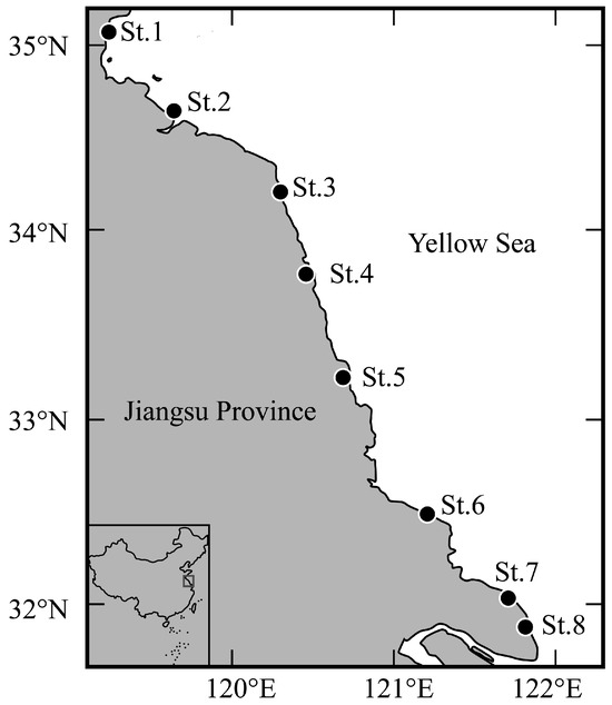 At eight stations (St.1–St.8; Figure 1 and Table 1) in the surf zone along the coast of Jiangsu Province, sampling was conducted once per month using a seine net (1 × 4 m; 1 mm mesh aperture) during the spring tide from February 2024 to January 2025. The net was pulled by two samplers parallel to the shoreline at a depth of 0.2–1.0 m over a distance of a 50 m transect. Three replicate tows were completed at each sampling station, with all samples immediately preserved in 5% seawater formalin for the subsequent laboratory analysis. Water temperature (°C) and salinity (ppt) were measured on site using a thermometer and a digital salinometer, respectively, during the sampling period.