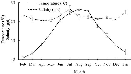 Mean values of water temperature and salinity from February 2024 to January 2025. Whiskers represent standard errors.