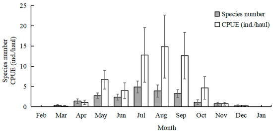 Temporal variations in mean values of species number and catch per unit effort (CPUE). Whiskers represent standard errors.
