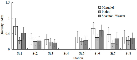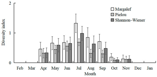 Temporal variations in mean values of Margalef’s richness index, Shannon–Wiener’s diversity index (H′), and Pielou’s evenness index (J). Whiskers represent standard errors.