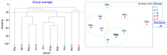 The CPUE data were square-root-transformed to reduce the effects of extremum and then subjected to a non-metric multi-dimensional scaling ordination (n-MDS) using Bray–Curtis’s similarity index [20]. For visualization, a two-dimensional n-MDS plot was generated with cluster points (CLUSTER) to illustrate the relationships among samples. An analysis of similarities (ANOSIM) was used to test differences between communities by month or station, and the percentage similarity analysis (similarity of percentage analysis, or SIMPER) was used to ascertain the similarity and the typical species within a similar community structure. Primer 6.0 [23] was used to perform this analysis.