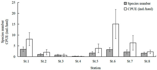 The highest total species number was observed at St.6 (23 species), followed by St.1 (20 species) and St.7 (18 species). St.1 and St.6 had higher mean values of species number than the other stations (Kruskal–Wallis test, p = 0.022; Figure 6). The mean values of CPUE at St.1, St.6, and St.7 were higher than the other stations (Kruskal–Wallis test, p = 0.020; Figure 6). The mean values of Margalef’s richness index at St.1 and St.6 were higher than the other stations (Kruskal–Wallis test, p = 0.135; Figure 7). The mean values of Pielou’s evenness index were higher at St.1 and St.6 compared with the other stations (Kruskal–Wallis test, p = 0.254; Figure 7). The mean values of Shannon–Wiener’s diversity index were higher at St.1 and St.6 compared with the other stations (Kruskal–Wallis test, p = 0.125; Figure 7). Similar trends were discernible for each parameter, and significant differences were found for the species number and CPUE among sampling stations.