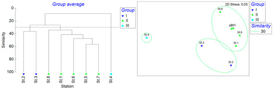 The cluster analysis of the eight stations identified three distinct groups based on a similarity threshold of 30 (Figure 8). St.2 and St.3 were clustered as group I. St.1 and Sts.5–8 were group II, and St.4 was group III. The n-MDS showed that the stress was 0.03. The ANOSIM analysis showed that R = 0.882 and P = 0.6, indicating that the differences between the three groups were not significant. The SIMPER analysis showed that the average similarity within group I was 36.30%, with Amblychaeturichthys hexanema contributing 54.83%, Acanthogobius ommaturus contributing 28.64%, and Tridentiger trigonocephalus contributing 16.53%. The average similarity within Group II was 41.40%, with Amoya pflaumi contributing 26.87%, Mugilogobius abei contributing 13.20%, and Periophthalmus modestus contributing 10.13%. Group III had only one station.