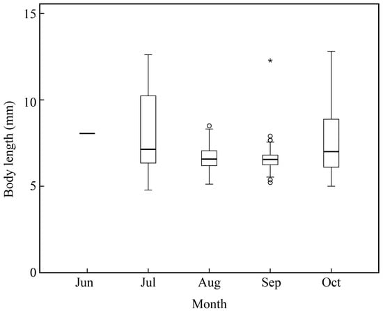 Body length distribution of Amoya pflaumi in the surf zone along the coast of Jiangsu Province. Open circles represent potential outliers, asterisk represents extreme value.