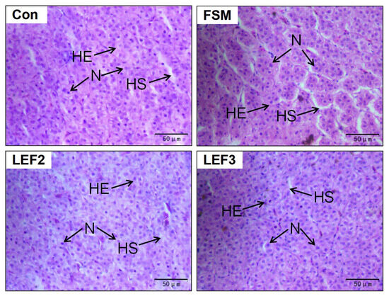 Liver morphology of Japanese eel fed with LEF diets. N, nucleus. HE, hepatocyte. HS, hepatic sinusoid (Magnification 400×).