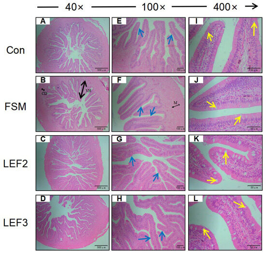 Intestine morphology of Japanese eel fed with LEF diets. (A): Intestinal morphology of Con group at 40×; (B): Intestinal morphology of FSM group at 40×; (C): Intestinal morphology of LEF2 group at 40×; (D): Intestinal morphology of LEF3 group at 40×; (E): Intestinal morphology of Con group at 100×; (F): Intestinal morphology of FSM group at 100×; (G): Intestinal morphology of LEF2 group at 100×; (H): Intestinal morphology of LEF3 group at 100×; (I): Intestinal morphology of Con group at 400×. (J): Intestinal morphology of FSM group at 400×. (K): Intestinal morphology of LEF2 group at 400×. (L): Intestinal morphology of LEF3 group at 400×. CD, crypt depth. VH, villus height. M, Muscularis. Blue arrow: striated border. Yellow arrow: goblet cell.