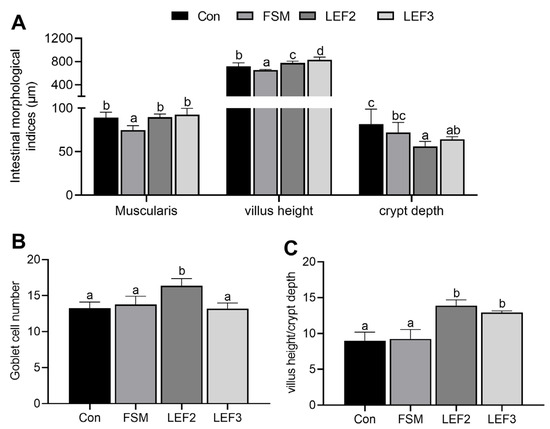 Intestinal morphometric indices of Japanese eel fed LEF diets. (A) Intestinal thickness of muscularis, villus height, and crypt depth in the intestine. (B) Number of intestinal goblet cells. (C) Intestinal villus height to crypt depth ratio. Values not sharing a common superscript in the same row differ significantly (p < 0.05).