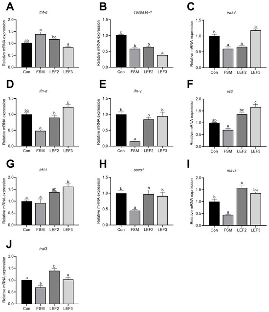 Expression levels of immune-related genes in the spleen of Japanese eel fed LEF diets. (A) Relative mRNA level of tumor necrosis factor-α (tnf-α) in the spleen. (B) Relative mRNA level of caspase-1 in the spleen. (C) Relative mRNA level of interleukin-1 receptor-associated kinase 4 (irak4) in the spleen. (D) Relative mRNA level of interferon-α (ifn-α) in the spleen. (E) Relative mRNA level of interferon-γ (ifn-γ) in the spleen. (F) Relative mRNA level of interferon regulatory factor 3 (irf3) in the spleen. (G) Relative mRNA level of interferon regulatory factor 11 (irf11) in the spleen. (H) Relative mRNA level of suppressor of cytokine signaling 1 (socs1) in the spleen. (I) Relative mRNA level of mitochondrial antiviral signaling (mavs) in the spleen. (J) Relative mRNA level of TNF receptor associated factor 3 (traf3) in the spleen. Values not sharing a common superscript in the same row differ significantly (p < 0.05).