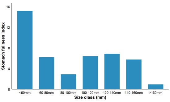 The stomach fullness index was highest in the body length group measuring < 60 mm at 32.20 (Figure 2), due to their consumption of large amounts of Palaemon gravieri. The index values for other groups were all below 10, where the body length groups measuring 120–140 mm and 100–120 mm had relatively high index values of 6.85 and 6.40, respectively. However, the empty stomach rate decreased as the body length increased, with lower empty stomach rates mainly occurring in the body length groups measuring > 160 mm and 140–160 mm. The result of Kruskal–Wallis test indicated that the changes in the stomach fullness index with body length classes were significant (p < 0.05).