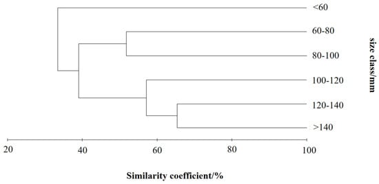 Based on the Bray–Curtis similarity coefficient and using 20% similarity as the criterion, the eight body length groups of big head croaker were divided into four groups (Figure 3). In general, big head croaker with a body length less than 60 mm formed one group, which primarily fed on P. gravieri and Oxycephalus clausi. Big head croaker with body lengths of 60–100 mm had a food composition similarity of 51.75%, and they mainly fed on Parapenaeopsis tenella, A. longirostris, and N. awatschensis. The third group contained big head croaker with body lengths of 100–120 mm and they mainly fed on H. nehereus and Coilia nasus. The fourth group contained big head croaker with body lengths greater than 120 mm; the food composition similarity within this group was 65.39% and they mainly fed on H. nehereus and N. awatschensis.