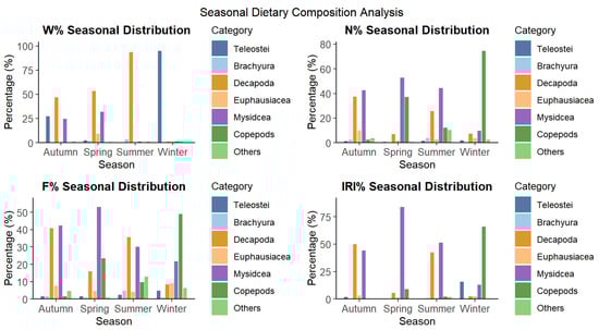 The dietary compositions of big head croaker in the Yangtze River estuary also exhibited distinct seasonal variations. Based on IRI%, the high importance prey items were Mysidacea in both spring and summer, with IRI% values of 83.86% and 51.38%, respectively. In autumn, the dominant prey item for big head croaker was Decapoda (50.07%) and copepods (66.06%) were the dominant prey items in winter. In terms of F%, the most frequent prey species consumed by big head croaker in spring were Mysidacea, followed by copepods, with F% values of 53.03% and 23.48%, respectively. In summer, the most frequently consumed prey items were Decapoda, followed by Mysidacea, with F% values of 35.77% and 30.08%, respectively. In autumn, the most frequently consumed prey items were Mysidacea and Decapoda, with F% values of 42.42% and 40.91%, respectively. In winter, copepods had the highest F% value of 48.95% (Figure 4). In terms of W%, the prey species with the highest W% values consumed by big head croaker in spring, summer, and autumn were Decapoda, with W% values of 53.41%, 93.72%, and 46.84%, respectively. In winter, the prey item with the highest W% value was Teleostei (95.07%). In terms of N%, Mysidacea were the most frequently consumed prey species in spring, summer, and autumn, with N% values of 52.74%, 44.27%, and 42.50%, respectively. In winter, copepods had the highest N% value of 74.66%.