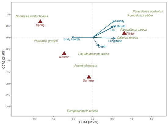 According to the VIF test results, temperature had the highest VIF value (287.58); considering its high relationship with different seasons, the temperature was omitted in the following CCA test. Different seasons also had relatively high VIF values (13.48–17.47) but this variable was retained because it is important to study seasonal variations in fish feeding habits. The final explanatory variables were body length, water depth, salinity, dissolved oxygen, longitude, latitude, and season. CCA indicated that environmental factors explained 23.25% of the total variation in the prey of big head croaker in the Yangtze River estuary, where the first and second axes explained 62.33% of the relationships between biotic and explanatory variables.