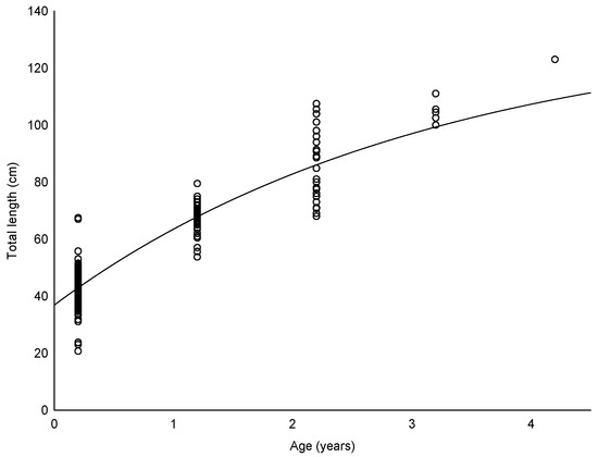 Due to the small number of males and females, we modelled age on the total sample, regardless of sex. The von Bertalanffy growth model described the growth of L. caudatus well, with an estimated asymptotic length of 134.98 cm and a growth constant of 0.32 year−1. These values suggest a high growth rate of the species, with individuals approaching their maximum length in the sample in approximately 4 to 5 years. However, we acknowledge that there are some uncertainties regarding the observed length at time 0 from the growth model. While this model suggests an initial length close to 40.0 cm, which is larger than the size of the smallest collected individual (20.7 cm), this value should not be interpreted literally as the length at hatching. As noted by Robertson [7], L. caudatus hatches at a total length of 4.75 to 5.03 mm. So, the back-calculated length at time 0 represents an extrapolation of the von Bertalanffy growth curve based on the size range of the analysed samples. This pattern is consistent with findings from other studies on L. caudatus [6,8,9], where the observed length at time 0 often exceeds the known hatching size and corresponds more closely with the lower length from the length range of the sampled fish. These observations may indicate that the length at time 0 in such models primarily reflects the available data rather than the true size at hatching. In future work, incorporating more empirical data on early life stages and, more importantly, expanding the size range of samples (including the smallest individuals) could help refine the growth model parameters and reduce this source of uncertainty.