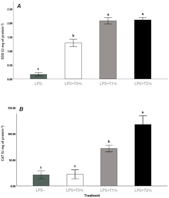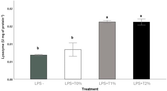 Regarding lysozyme activity, LPS+T1% and LPS+T2% presented higher values, which were statistically different from LPS+T0% and LPS-. No differences in lysozyme activity were observed between LPS+T0% and LPS- (Figure 2).