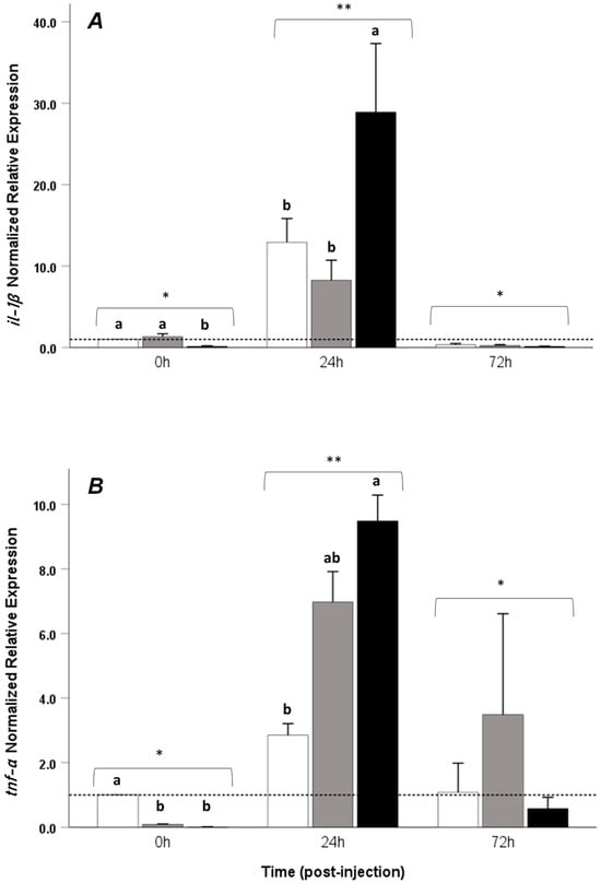 Relative mRNA expression of (A) il-1β and (B) tnf-α in the head kidney of Seriola rivoliana juveniles fed with different amounts of exogenous taurine (0, 1, and 2%) at 0, 24, and 72 h post-LPS injection. LPS+0% taurine: white bars; LPS+1% taurine: gray bars; LPS+2% taurine: black bars. Data are shown as mean ± SE fold increase relative to the control (dotted line). Different lowercase letters indicate statistically significant differences between treatments at the same time point (one-way ANOVA, p < 0.05); asterisks (*) (**) denote significant differences in the interaction effects between time and treatment (two-way ANOVA, p < 0.05).