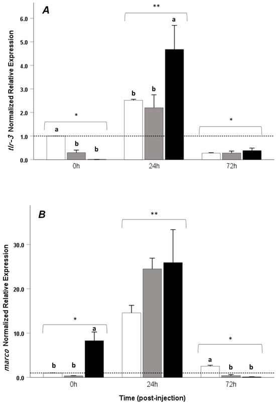 Relative mRNA expression of (A) tlr-3 and (B) marco in the head kidney of Seriola rivoliana juveniles fed with different amounts of exogenous taurine (0, 1, and 2%) at 0, 24, and 72 h post-LPS injection. LPS+0% taurine: white bars; LPS+1% taurine: gray bars; LPS+2% taurine: black bars. Data are shown as mean ± SE fold increase relative to the control (dotted line). Different lowercase letters indicate statistically significant differences between treatments at the same time point (one-way ANOVA, p < 0.05); asterisks (*) (**) denote significant differences in the interaction effects between time and treatment (two-way ANOVA, p < 0.05).