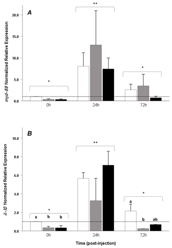 Relative mRNA expression of (A) myd-88 and (B) il-10 in the head kidney of Seriola rivoliana juveniles fed with different amounts of exogenous taurine (0, 1, and 2%) at 0, 24, and 72 h post-LPS injection. LPS+0% taurine: white bars; LPS+1% taurine: gray bars; LPS+2% taurine: black bars. Data are shown as mean ± SE fold increase relative to the control (dotted line). Different lowercase letters indicate statistically significant differences between treatments at the same time point (one-way ANOVA, p < 0.05); asterisks (*) (**) denote significant differences in the interaction effects between time and treatment (two-way ANOVA, p < 0.05).