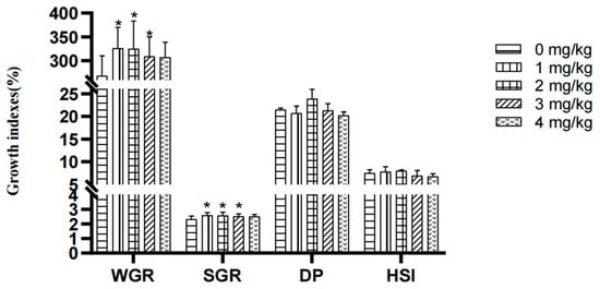 Effects of dietary yeast selenium supplementation levels on growth indexes in Cherax quadricarinatus. * represent significant (p < 0.05), and the no symbol are insignificant (p > 0.05).