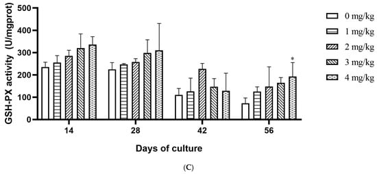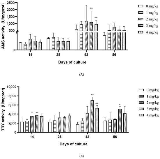 Compared to the control group, on day 14, adding 4 mg/kg of yeast selenium significantly increased liver and pancreatic AMS activity (p < 0.05); on day 42, adding 3 mg/kg and 4 mg/kg of yeast selenium extremely significantly increased liver and pancreatic AMS activity (p < 0.01) (Figure 3A). Compared to the control group, on day 42, adding 3 mg/kg and 4 mg/kg of yeast selenium extremely significantly increased liver and pancreatic TRY activity (p < 0.01); on day 56, adding 3 mg/kg of yeast selenium significantly increased liver and pancreatic TRY activity (p < 0.05) (Figure 3B).