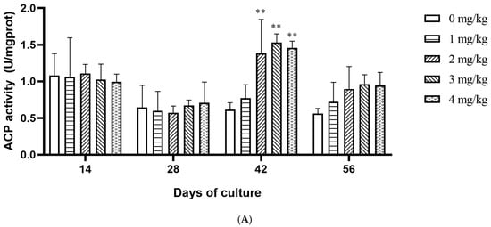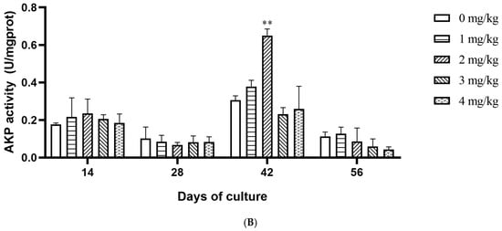 The determination of immunoenzyme activity at different culture times showed that, on day 42, the activity of ACP in the liver and pancreas was significantly increased by adding 2 mg/kg, 3 mg/kg and 4 mg/kg yeast selenium (p < 0.01) (Figure 5A), and the activity of AKP in liver and pancreas was significantly increased by adding 2 mg/kg yeast selenium (p < 0.01) (Figure 5B).