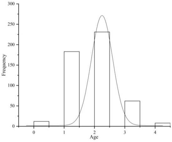 The ages of the T. strauchii specimens ranged from 0 to 4 years (Figure 2B). The mean age was estimated at 1.74 ± 0.77 years, with a predominance of individuals aged 2 years or more. Among them, fish in age group 2+ accounted for 46.8%, those in age group 0+ accounted for 2.4%, those in age group 1+ accounted for 36.6%, those in age group 3+ accounted for 12.6%, and those in age group 4+ accounted for only 1.6% (Figure 3).