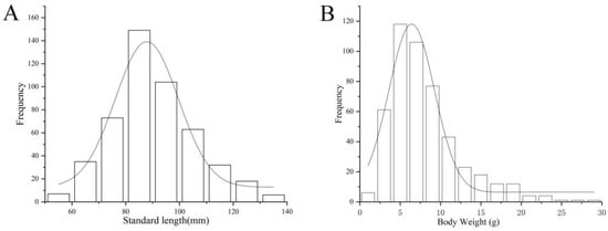 The SL of T. strauchii in this study varied between 51.63 and 137.09 mm, with an average of 88.69 ± 15.65 mm, aligning with a normal distribution (nonparametric analysis, skewness = 0.39, kurtosis = 0.12) (Figure 4A). The BW ranged from 1.18 to 22.99 g, with an average of 7.69 ± 4.58 g, which did not follow a normal distribution (nonparametric analysis, skewness = 1.39, kurtosis = 2.38) (Figure 4B).