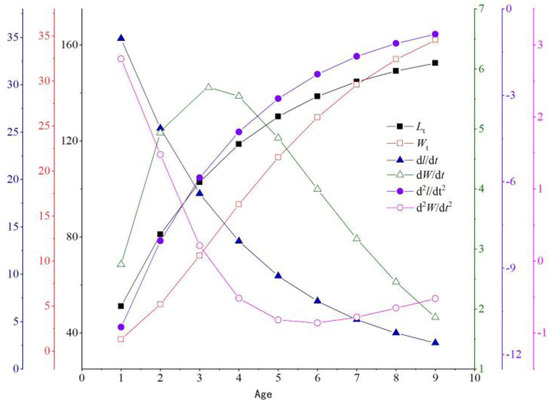 The growth curves of the SL and BW of T. strauchii showed an increase with age; the growth rate of SL decreased with age, whereas the growth rate of BW increased with age before the age of 3 years and then decreased; the acceleration of SL growth increased with age, whereas that of BW growth decreased with age, and the curves for SL and BW intersected at age 2.5 years. The ti of T. strauchii was 3.23 and the corresponding SL and BW values were 106.89 mm and 12.07 g, respectively. The derivative dW/dt peaked at t = 3.23 years and then started to decrease (Figure 6).