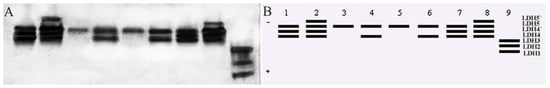 (A) Electrophoretic profiles of T. strauchii LDH isozymes. (B) Mode chart. Note: 1: gonad; 2: kidney; 3: fin; 4: brain; 5: eye; 6: gill; 7: heart; 8: muscle; 9: liver.