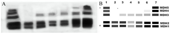 (A) Electrophoretic profiles of T. strauchii MDH isozymes. (B) Mode chart. Note: 1: muscle; 2: heart; 3: gill; 4: eye; 5: brain; 6: fin; 7: kidney.
