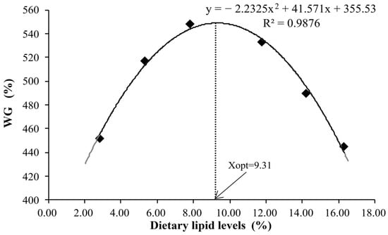 Relationship of the weight gain (WG) with dietary lipid levels of juvenile kelp grouper.