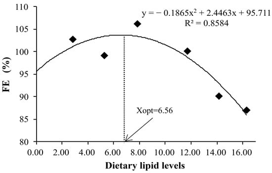 Relationship of the feed efficiency (FE) with dietary lipid levels of juvenile kelp grouper.