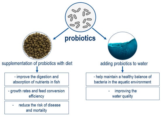 The effect of probiotic preparations on various living objects has been studied for a long time. Numerous studies on the use of probiotics in aquaculture are devoted to the study of various fish-breeding characteristics of cultured objects, including sturgeon [53], trout [54], carp [55], catfish [56], Australian red-claw crayfish [57], shrimp [58], and others. Probiotics are introduced in aquaculture through feed and by adding strains into water [59] (Figure 2).