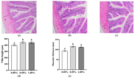 Effects of dietary SB at different levels for 56 d on intestinal morphology of largemouth bass. (a) 0.00% SB; (b) 0.50% SB; (c) 1.00% SB; (d) villus height (VH); (e) muscular thickness (MT). Nine fish in each treatment group were utilized in the data analysis, three slices were made for each fish, and each slice was measured three times (n = 81). Identical lowercase letters indicate no significant differences between groups (p > 0.05).