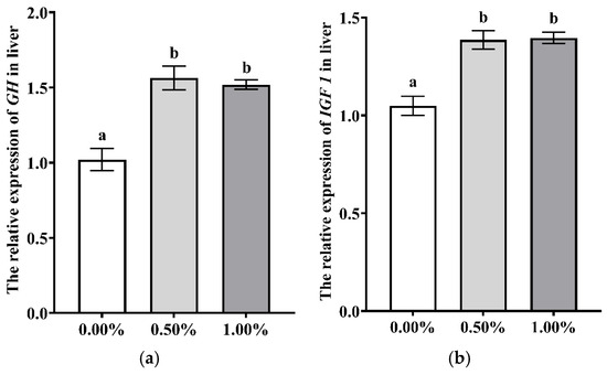 Both the 0.50% and 1.00% SB groups had significantly higher mRNA expression levels of GH and IGF 1 genes in the liver than those in the control group (p < 0.05; Figure 2). No significant differences were found between the 0.50 and 1.00% SB groups (p > 0.05).