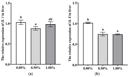 The mRNA expression levels of IL 1 gene in the liver of the 0.50% SB group were significantly lower than that in the control group (p < 0.05; Figure 3). The mRNA expression levels of IL 8 gene in the liver were significantly lower in the 0.50% and 1.00% SB groups than in the control group (p < 0.05).