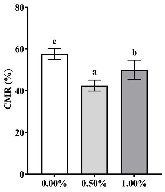 After ammonia stress, cumulative mortality rate (CMR) was significantly lower in the 0.50% and 1.00% SB groups than that in the control group, and lowest in the 0.50% SB group (p < 0.05; Figure 4).