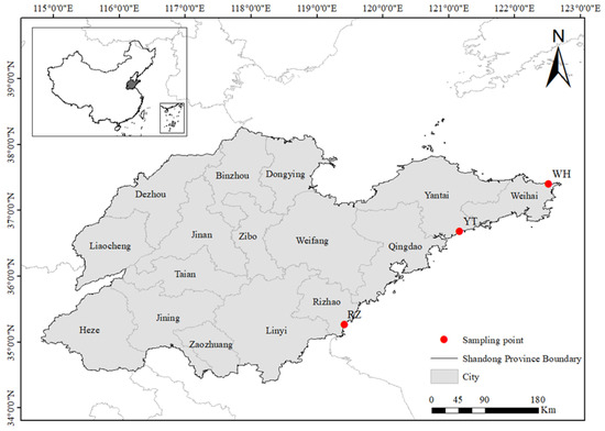 Map of three major cities in China where samples were collected. The three locations (YT: Haiyang Yellow Sea Fisheries Co., Ltd., RZ: Rizhao Rongwang aquatic science and technology Co., Ltd., WH: Weihai Shenghang aquatic science and technology Co., Ltd.) along the Yellow Sea coast of China.