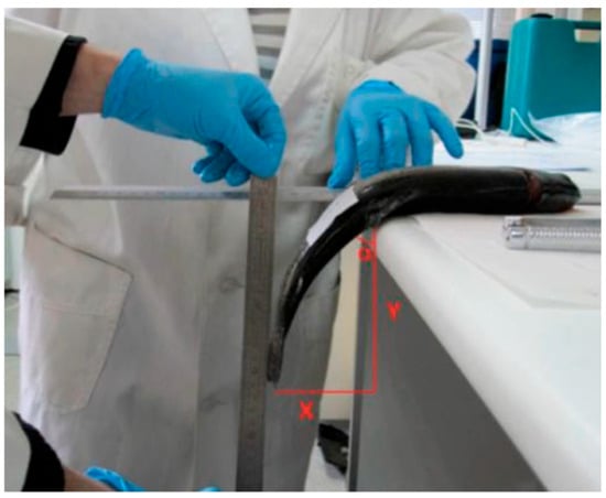 The progression of RM was evaluated following Cuttinger’s method [] at 0 and 24 h post-mortem. During the 24 h period, the carcasses were stored on trays with ice inside a standard refrigerator at approximately 4 °C. Each trout was placed laterally on a flat surface, with the section from the dorsal fin to the tail left unsupported over the edge (Figure 1). The RM angle was determined using the formula α = tan−1(X/Y). In this equation, X corresponds to the horizontal length (cm) of a right triangle’s leg, while Y refers to the vertical leg length (cm). Muscle pH was recorded at the anterior section of the dorsal muscle, after it was detached from the head, at both 0 and 24 h post-mortem using a temperature-compensated pH meter (HANNA, Salaj, Romania, model HI9125).
