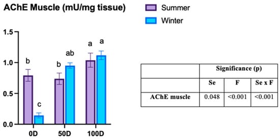 The activity of AChE in muscle tissue showed a significant interaction between pre-slaughter fasting and season (Figure 2). Non-fasted fish in winter exhibited the lowest AChE muscle activity compared to other groups. For 0D, winter groups showed lower activity than those in summer (0.14 ± 0.18 vs. 0.79 ± 0.30 mU/mg). However, in fasted fish, no significant differences were observed between the seasons. In summer, 100D fish had higher AChE activity than both 0D and 50D fish (100D: 1.03 ± 0.36 vs. 50D: 0.73 ± 0.29 vs. 0D: 0.79 ± 0.30 mU/mg), while in winter, 0D fish displayed lower activity than 100D fish (0.14 ± 0.18 vs. 1.11 ± 0.30 mU/mg).