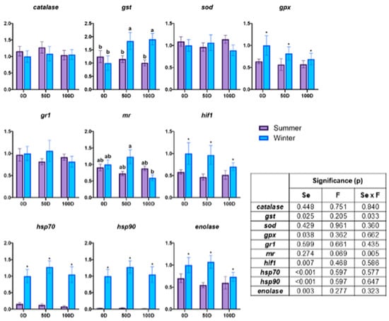 Gene expression in the muscle tissue of rainbow trout subjected to different pre-slaughter fasting durations and seasons. The data are presented as mean ± SEM (n = 30). 0D: no fasting; 50D: 65.5 ± 0.22 °C d of fasting in summer (3 days) and 58.7 ± 2.21 °C d of fasting in winter (6 days); 100D: 131.3 ± 0.07 °C d of fasting in summer (6 days) and 114.5 ± 1.86 °C d of fasting in winter (13 days); gst: glutathione S-transferase; sod: superoxide dismutase; gpx: glutathione peroxidase; gr1: glucocorticoid receptor 1; mr: mineralocorticoid receptor; hif1: hypoxia-inducible factor 1; hsp70: heat shock protein 70; hsp90: heat shock protein 90; Se: season; F: pre-slaughter fasting. A two-way ANOVA was conducted to evaluate the effects of fasting duration (0, 50, or 100 °C d) and season (summer or winter), with both factors treated as fixed variables. Tukey’s post-hoc test was used for pairwise comparisons. Significant seasonal differences are marked with an asterisk (*) (p < 0.05), and distinct letters (a, b) indicate significant differences between groups (p < 0.05).