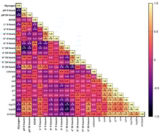 Heatmap displaying Pearson’s correlation coefficients among muscle parameters (glycogen, pH, AChE activity, color metrics, and gene expression). The values inside each box represent the r value for the correlations. * p < 0.05. L*: lightness; a*: redness; b*: yellowness; C*: chroma = √(a2 + b2); h*: Hue = arctan(b*/a*) × 57.29; gst: glutathione S-transferase; sod: superoxide dismutase; gpx: glutathione peroxidase; gr1: glucocorticoid receptor 1; mr: mineralocorticoid receptor; hif1: hypoxia-inducible factor 1; hsp70: heat shock protein 70; hsp90: heat shock protein 90.