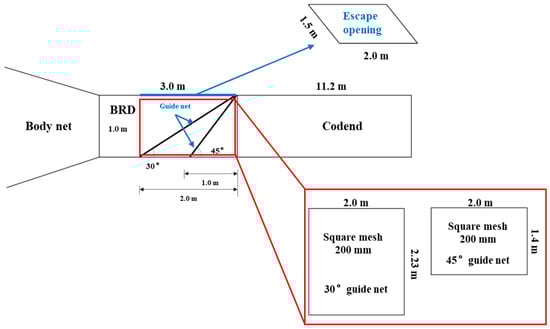 This study used a midwater trawl, as classified by the Food and Agriculture Organization (FAO), with same fishing gear as that used in a previous study []. Schematic diagrams of the midwater trawl and BRD installation without pinger are shown in Figure 1 and Figure 2. The net had a total length of 140 m (excluding the towing warp), including a head rope and ground rope measuring 59.3 m, with the codend (hereinafter COD) measuring as 11.2 m. As shown in Figure 1, the COD comprised three layers of netting with varying mesh sizes: 120 (Codend A), 62 (Codend B), and 28 mm (Codend C), from the outermost to the innermost layer. For the marine mammal bycatch, a guide net equipped with a net panel as a BRD was installed directly in front of the COD of the midwater trawl gear (Figure 2). The net panel was made using square mesh polyethylene (PE) netting with a mesh size of 200 mm (mesh perimeter 800 mm), and two guide nets with tilt angles of 30° and 45° were prepared for use. Both nets had the same width (2.0 m), but their length differed depending on the tilt angle: 2.23 m for 30° and 1.4 m for 45°. The position where the body net was attached varied accordingly. The escape opening measured 2 × 1.5 m (vertical × horizontal), and a covernet with a mesh size of PE 46 ± 1.4 (D) mm was attached to the escape opening to capture fish species that escaped into the BRD via the guide net.