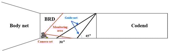 Camera observation analysis showed that the net panel of 30° BRD unfolded more effectively compared to the one in 45° BRD, which was less stable. The net unfolded loosely for the 30° BRD, creating ample internal space. Target fish from below entered the COD, whereas those entering from above either reached the COD or were redirected into the BRD. However, for the 45° BRD, the net failed to unfold properly owing to resistance, causing distortion. This led to the front section of the COD remaining partially collapsed, disrupting water flow and resulting in fish being discarded through the BRD. These findings indicate that a tilt angle of 30° is more suitable for the net panel than a 45° tilt angle. Although BRDs with net panels are commonly used in turtle excluder devices [,,], few studies have examined how the unfolding of guide nets affects net performance. The further study of this will establish the groundwork for future research.