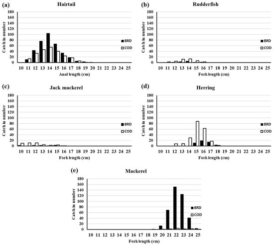 Body length distributions of (a) hairtail, (b) rudderfish, (c) jack mackerel, (d) herring, and (e) mackerel caught by Tamgu-20. Black bars indicate the number of fish caught from BRD, open bars indicate the number of fish caught from COD.