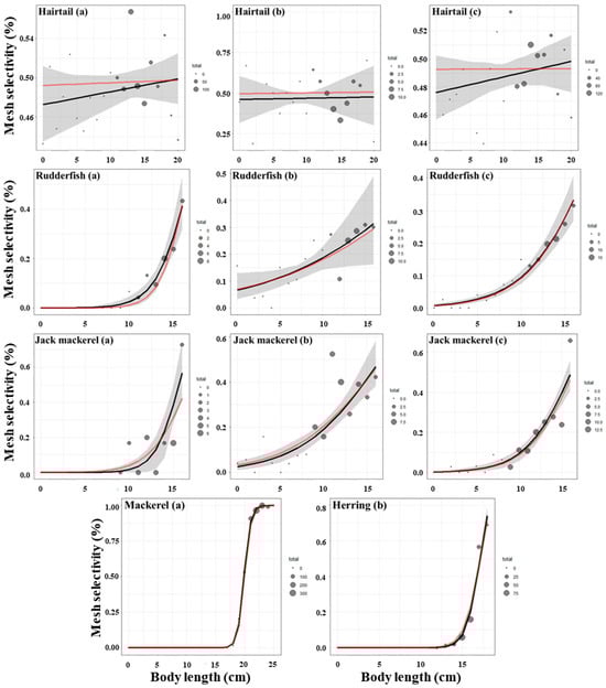 BRD mesh selectivity curves for hairtail, rudderfish, jack mackerel, mackerel, and herring by (a) 30° angle BRD, (b) 45° angle BRD, and (c) total BRD. The black line shows the selectivity curve averaged from the selectivity curve of each haul with a random effects model. The shaded area indicates the 95% confidence range of the averaged selectivity curve, and the red line indicates the selectivity curve estimated from the pooled data of all hauls with a fixed effects model. The circle indicates the scale of the total number of fish caught by Tamgu-20.